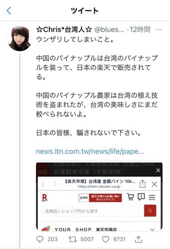 4月3日、「台湾産パイナップルと称して中国産パイナップルを売っている日本のWebショップがある」という報道が台湾大手メディアであった。同日、それが日本語で拡散されたために、その店だと誤解されたWebショップが対応に追われるという事態が起きている。